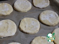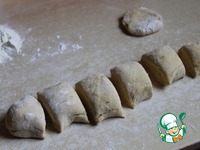 Делим тесто на несколько частей, у меня 9 получилось. Раскатываем слегка. Я их раскатывала, а вообще, надо было просто руками размять и потолще делать, мои тонковатые получились. |