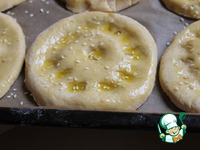Делаем пальчиком такие углубления, смазываем маслом оливковым и посыпаем кунжутом. Можно делать продольные борозды. Cтавим в духовку на 20 минут при 200*C |