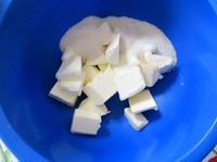 Масло комнатной температуры нарезать кубиками, поместить в миску, засыпать сахаром и мукой. |