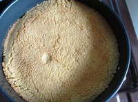 Форму для выпечки диаметром 20-22 см застелить кружком пекарской бумаги. Выложить 2/3 теста, равномерно распределить по дну, выровнять поверхность ложкой. Утрамбовывать не надо! |