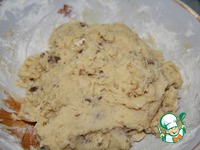 Потом добавляем муку с нарезанным на небольшие кусочки шоколадом и замешиваем тесто. Оно должно получится мягкое и немного прилипать к рукам. |