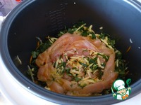 Далее в чашу мультиварки выкладываем тертый на крупной терке сыр, нашинкованную зелень и филе из куриных грудок. |