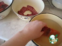 Каждый кусочек промываем в чистой воде от соли и укладываем в отдельную посудину для хранения рыбы. |