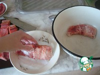 Обмакиваем каждый кусочек рыбы в эту смесь так, чтобы рыба была как бы в солёной шубке. и укладываем её в широкую посудину. С молокой или икрой проделать тоже самое. |
