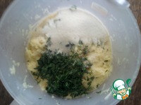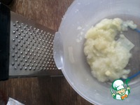 3. Потереть картофель на обычной мелкой терке. Перемешать с луковой кашицей. Добавить манку, соль, чеснок, зелень. Все хорошо перемешать. |