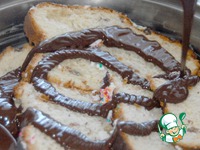 Форму смазываем сливочным маслом. Выкладываем половину ломтиков кулича. Выливаем растопленный шоколад. |