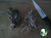 Когда мясо начинает отходить от костей (у меня около 2 часов), то вынимаем его и нарезаем на небольшие кусочки. |