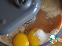 Добавляем желтки и сахар, взбиваем снова. Добавляем муку и разрыхлитель, СЛЕГКА перемешиваем. |