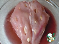 Куриную грудку промыть снять кожу и сделать небольшие прорезы (не до конца ) по всей грудки. Чеснок почистить и порезать на тонкие пластины. (Чеснок нарезала в 2 раза толще для наглядности. ) |