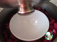Залить водой лепестки так, чтобы скрывало розы, но не доставала вода до краев пиалы примерно 1-2 см. Закрыть перевернутой крышкой. |