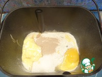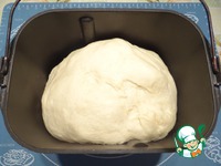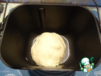 Затем добавляю теплое молоко, помещаю ведерко в хлебопечку и включаю режим замеса теста. |