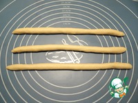 Беру три жгутика и плету косичку (пока Вы плетете косичку, остальное тесто не открывайте, пусть оно находится под пленкой, иначе сверху тесто засохнет). |