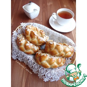 Накрываю пленкой и даю тесту увеличиться в объеме в 2 раза. Смазываю тесто взбитым яйцом, посыпаю миндальными лепестками. |