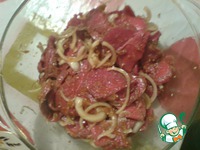 Описание: Пульгоги – очень популярное корейское блюдо из тонко нарезанной жареной говядины или свинины, замаринованной в соевом соусе с кунжутным маслом, зеленым луком, чесноком и приправами. Данный рецепт был встречен мною в кулинарном журнале и я тут же решилась его повторить. Теперь рада поделиться с Вами. Мясо играет всеми вкусами - в меру соленое, острое, с легкой сластинкой.
