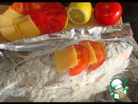 Кладём рыбу на фольгу. В брюшко рыбы укладываем грибную начинку. Скалываем животик зубочисткой, чтобы начинка не выпадала. |