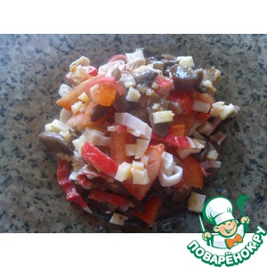 Пока готовятся грибы, нарезать крабовые палочки, помидор, чеснок и сыр. Чеснок и сыр я резала мелкими кубиками, но можно и натереть на терке.