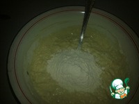 Добавить 3 стакана муки, постепенно - по половине стакана. Размешать ложкой. |