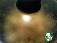 Накрываем крышкой снова и жарим сначала на сильном огне, потом огонь слегка уменьшаем. Но все же он остается ближе к сильному, чем к среднему. Периодически берем сотейник и хорошо его встряхиваем. |