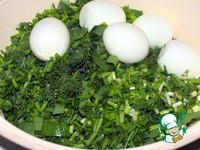 Накрошила 5 яиц и в начинку вылила один сырой белок, чтобы не оставался. Желток оставила для смазки пирогов. |