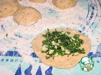 Скалкой его не раскатывала, а выминала руками. Положила начинку. Края собрала вместе и защипнула закрыв начинку. |