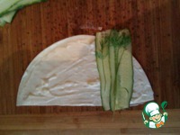 Берем половинку блинчика и смазываем нашим майонезом, кладём две полосочки огурчика и укропчик. |