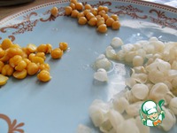 Другую луковку порезать мелко вручную, порубить зелень и добавить соль и наш набор специй, смолотых в ступке. |