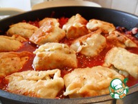 Но... когда все уже было готово и пельмешки благоухали в блюде - все были в восторге. Муж сказал, что очень необычное блюдо. Сочная начинка, мясной соус, который пропитал тесто, аромат пряных специй! очень сытное и вкусное блюдо, которое откроет новые грани - ведь можно экспериментировать с соусом, специями и начинкой, а может, даже взять и готовые пельмешки!