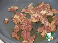 Замаринованное мясо мелко нарезать, обжарить на кунжутном масле |