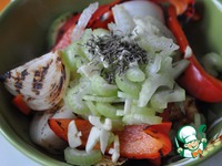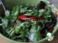 Посыпаем овощи любой любимой зеленью. Для меня наиболее сочетаема с ними кинза. Перемешиваем. |