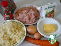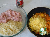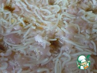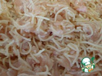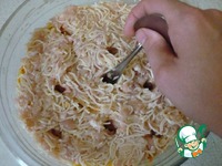 В одну посуду кладем вермишель, фарш из куриной грудки, прокрученный через крупную решетку, соевый соус, соль, тертый чеснок и перец. В другую поджарку - тертый сыр, яйцо и все подсолить. |