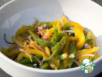 Добавить нарезанный полукольцами лук, смесь перцев и немного чили, присолить. Полить маслом и сбрызнуть бальзамическим уксусом или соком лимона. |