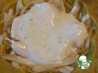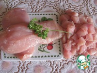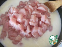 В сковороду наливаем воду, добавляем майонез или сметану, выкладываем куриное филе, перемешиваем, солим и тушим под крышкой 30 минут. |