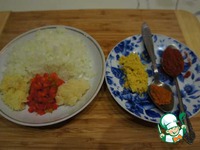 У свежего перца чили удалить семена и мелко нарезать. Лук измельчить. Имбирь натереть на терке. Чеснок выдавить через пресс. |