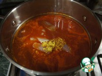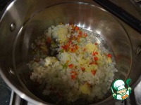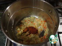 В кастрюле разогреть растительное масло. Добавить лук, чеснок, свежий перец чили и имбирь. Обжаривать, помешивая, до мягкости лука. |