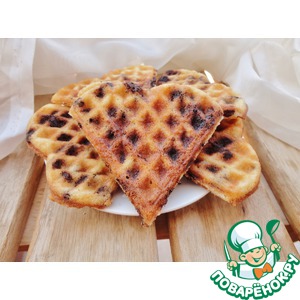 Теперь нам осталось только испечь вафли в вафельнице. Из этого количества у меня получилось 40 вафелек-сердечек, т. е. я испекла 8 толстых блинчиков. |