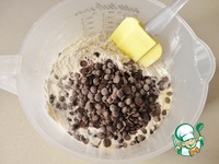 Затем добавляем муку и шоколадные капли, перемешиваем лопаткой. |