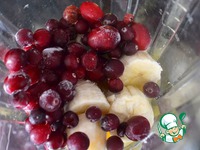 В блендер нарезать банан, положить замороженную клюкву. Влить сок. |