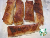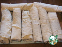 На край лаваша выкладываем начинку и заворачиваем в виде "сигар", смазывая кончики белком. Вот такие 8 "сигар" у нас получилось. |