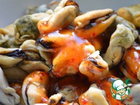 Мидии разморозить и слить жидкость. У каждой мидии удалить "бородку" (выступающий пучок волокон), промыть и откинуть на дуршлаг, затем смешайте мидии с соусом сладкий чили Blue Dragon |