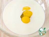 Для теста смешать теплое молоко, сахар, одно яйцо и желток. |