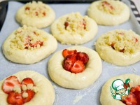 Смазать булочки яйцом. В углубление положить половинки клубники. Сверху посыпать штрейзелем. |