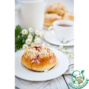 Описание: Воздушные и ароматные булочки с клубничной начинкой. Но главная их «изюминка» - это штрейзель! Эта золотистая крошка придает булочкам потрясающий сливочный аромат и вкус.