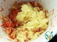 Морковь очистить, промыть, натереть на мелкой тёрке. Картофель очистить и промыть. Три штуки натереть на крупной тёрке, остальные картофелины на мелкой. Добавить специи. Все перемешать. |