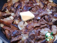 Добавляем кусочек сливочного масла. Я всегда так делаю, когда жарю грибы. Корочка и вкус грибов становятся лучше. |