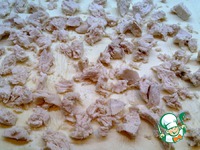 Отвариваем куриную грудку. С момента закипания 20 минут, не более. Режем курочку небольшими кусочками и выкладываем на слоеное тесто |