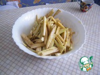 Баклажаны чистим от кожуры и режем соломкой, заливаем их взбитыми яйцами и оставляем на 30 мин. Соли в этом рецепте нет, т. к. в приправе есть соль. |