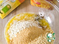 Смешать измельченные крекеры, овсяные хлопья, растопленное сливочное масло, коричневый и ванильный сахар. |