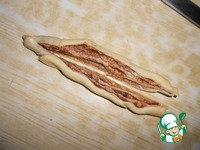 Затем, не дорезая до конца, разрезать рулетик вдоль на 2 части. |