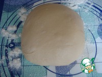 Для теста смешать опару,225 г. муки, сухое молоко,. соль, соду, сливочное масло и 2 яйца. |