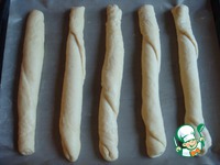 Свернуть рулетом, слегка перекрутить и сложить на застеленный бумагой для выпечки противень. |